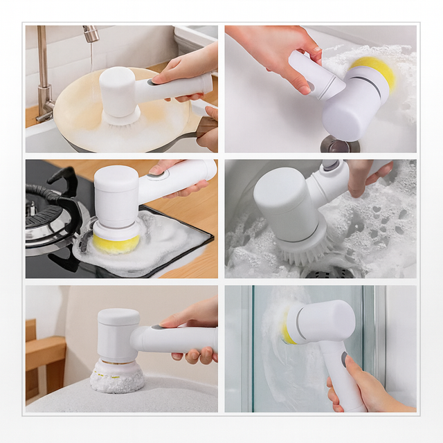 El M-Brush es un cepillo inalámbrico y recargable que acelera tu rutina de limpieza. Su motor giratorio y los 5 cabezales intercambiables te ayudan a remover grasa y sarro en azulejos, lavaplatos, lavamanos, tinas, cerámicas y superficies lisas, dejando todo brillante con solo presionar un botón.